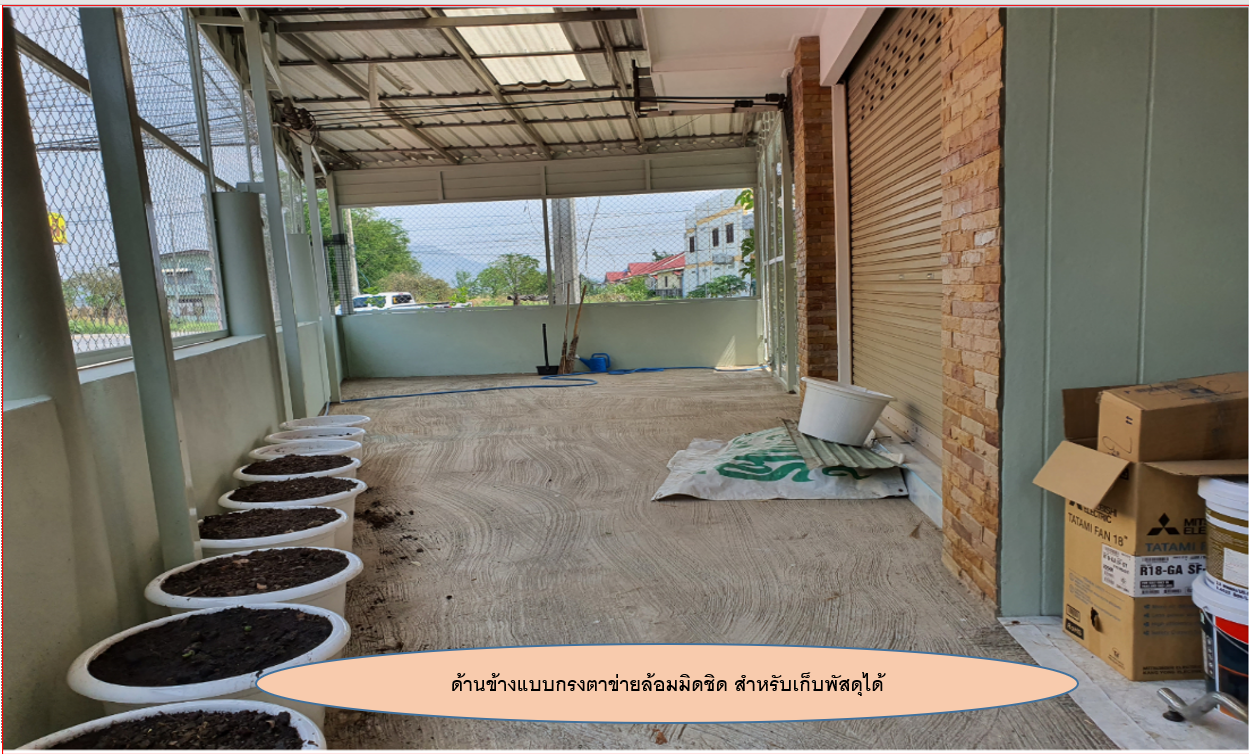 - ข้างในเป็นห้องโถงโล่ง พร้อมประตูกระจกเลื่อนขนาดใหญ่ ด้านข้างเป็นกรงตาข่ายเหล็กโปร่ง ล้อมมิดชิดสามารถเก็บพัสดุสิ่งของได้