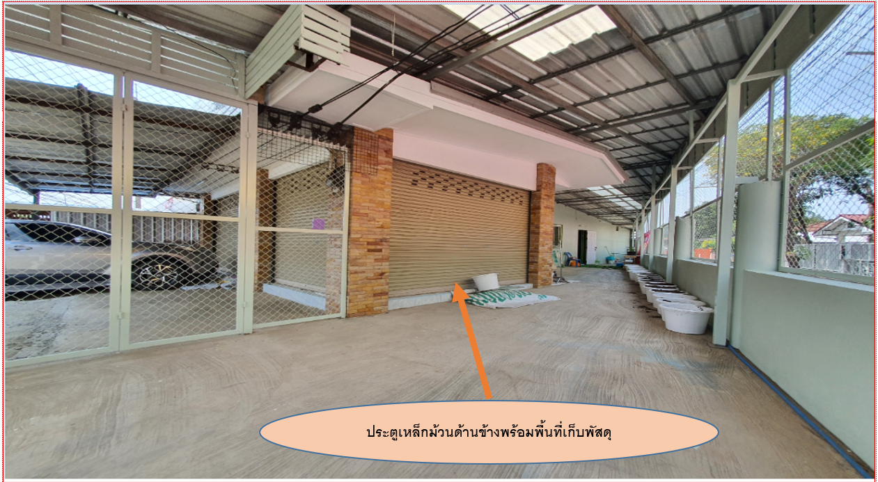 - มีพื้นที่เหลือสำหรับต่อเติมห้องด้านข้างได้ ประตูเหล็กบานเลื่อน 3 บาน (ด้านหน้า 2 บาน และด้านข้าง 1 บาน)