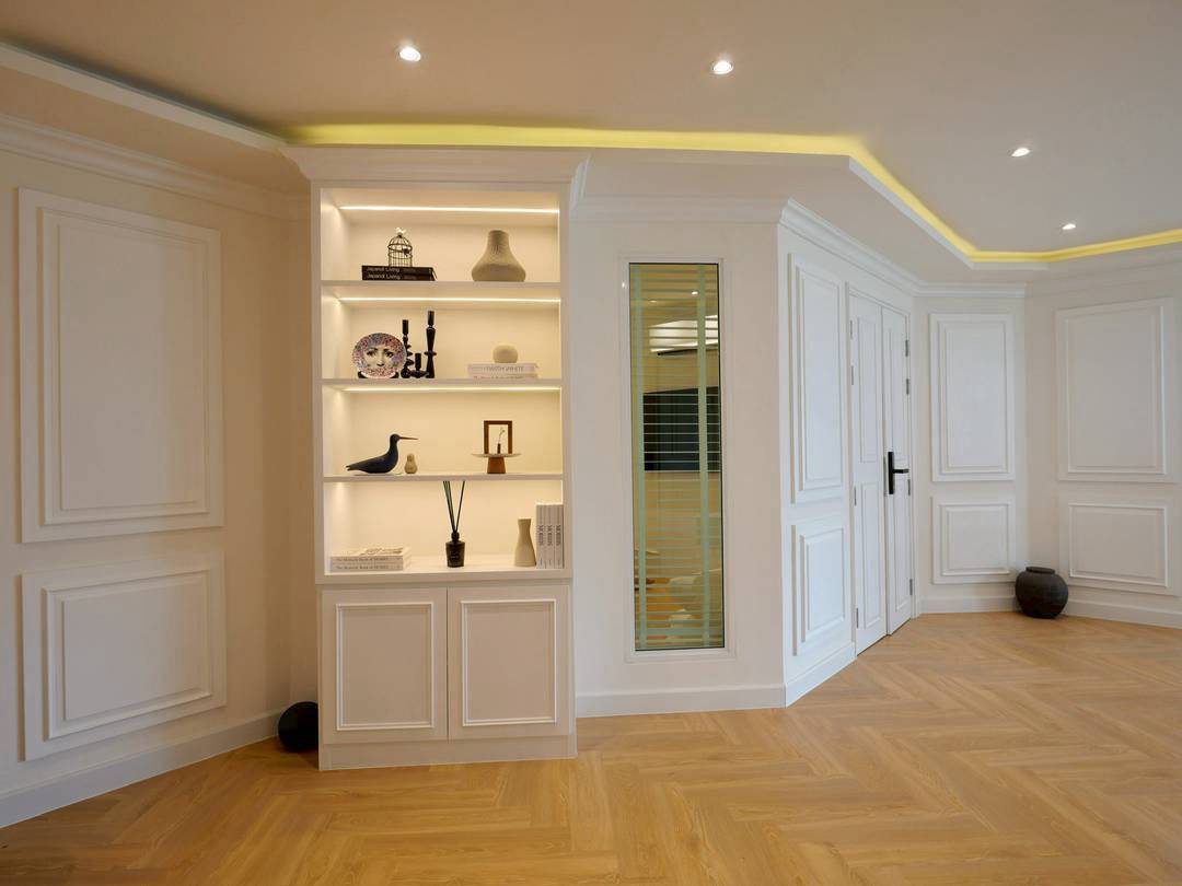 • Built-in shoe cabinet blending seamlessly into the design
